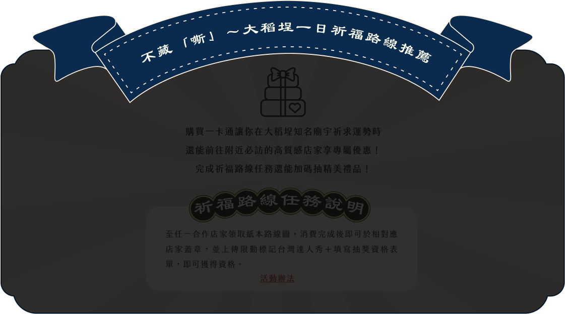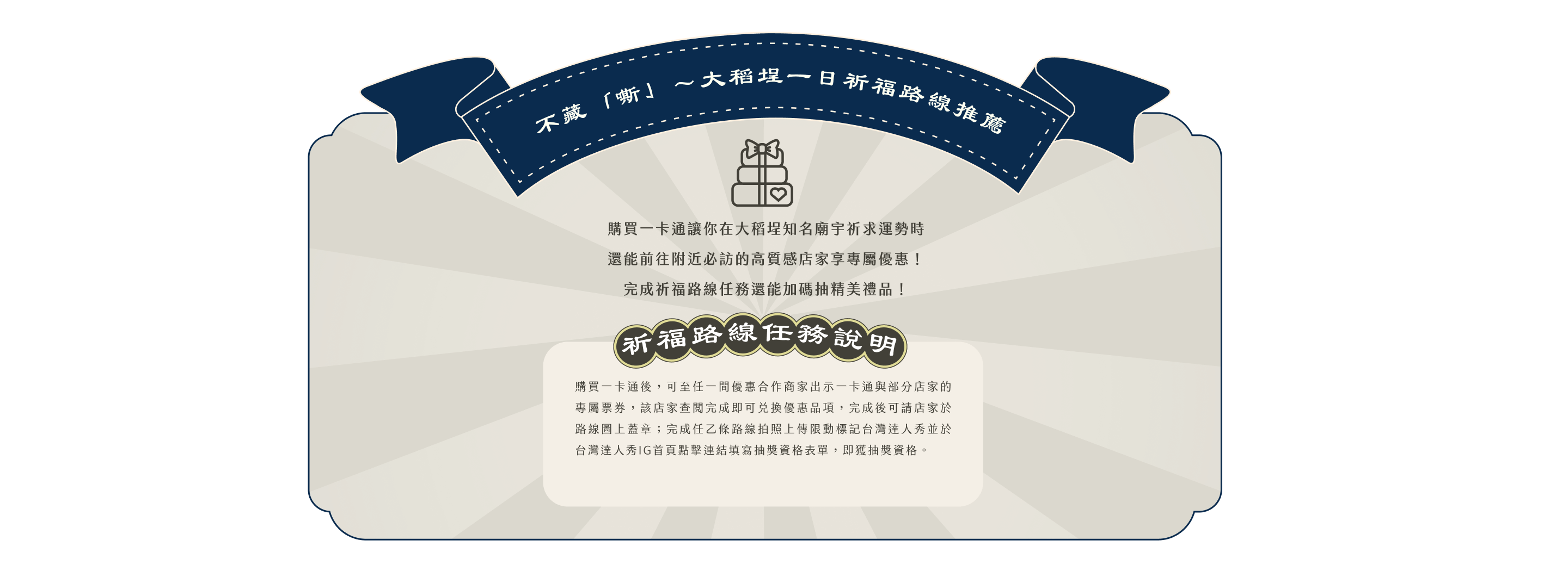 活動方式:活動期間參加「達人秀期末蛇麼好運我都要」活動,且依據主辦單位指示完成指定流程,即購買一卡通並完成運勢祈福路線任務,就可獲得抽獎機會。每人完成乙條運勢祈福路線任務,皆可填寫一次抽獎資格表單,運勢祈福路線任務共設有三條,完成此三條運勢祈福路線任務後最多可獲得三次抽獎機會。